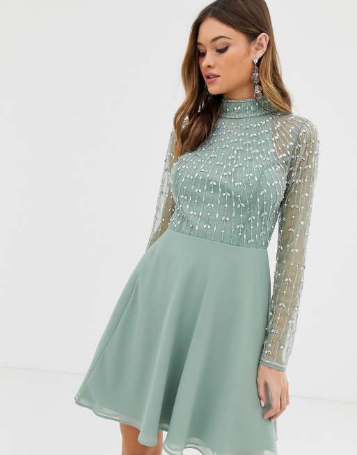 Dress in aqua green color with hand embroidery.